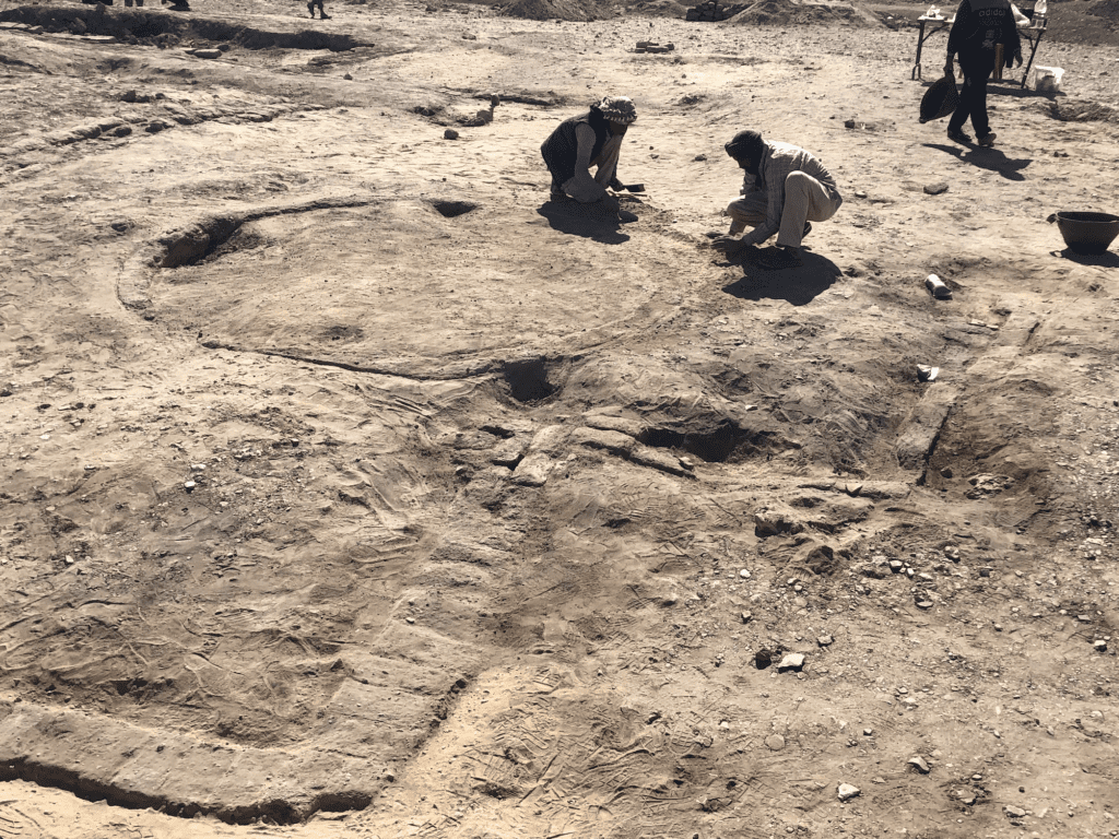 In addition to the newly discovered extensions of this wall, the team also investigated the remains of the northern-most circular mudbrick installation (see Figure 1). The area around the feature at the start of this season had three looters’ pits dug into it. From one of these we were able to determine that the remains of the installation were at least three courses of mudbricks deep. Additionally, the two other pits helped me determine the approximate extent of this feature, which we believed was necessary to get a proper map and record of. After our initial surface cleaning, we revealed that the feature is the largest of our three mudbrick circular installations within the area (Figure 4). The exact function and purpose of these three mudbrick installations is unknown to us at this time: our working hypothesis is that these were three silos for storing grain or food. Only continued archaeological excavation of them, with botanical and pottery samples collected, will help us to better understand the role of these installations in House E West.