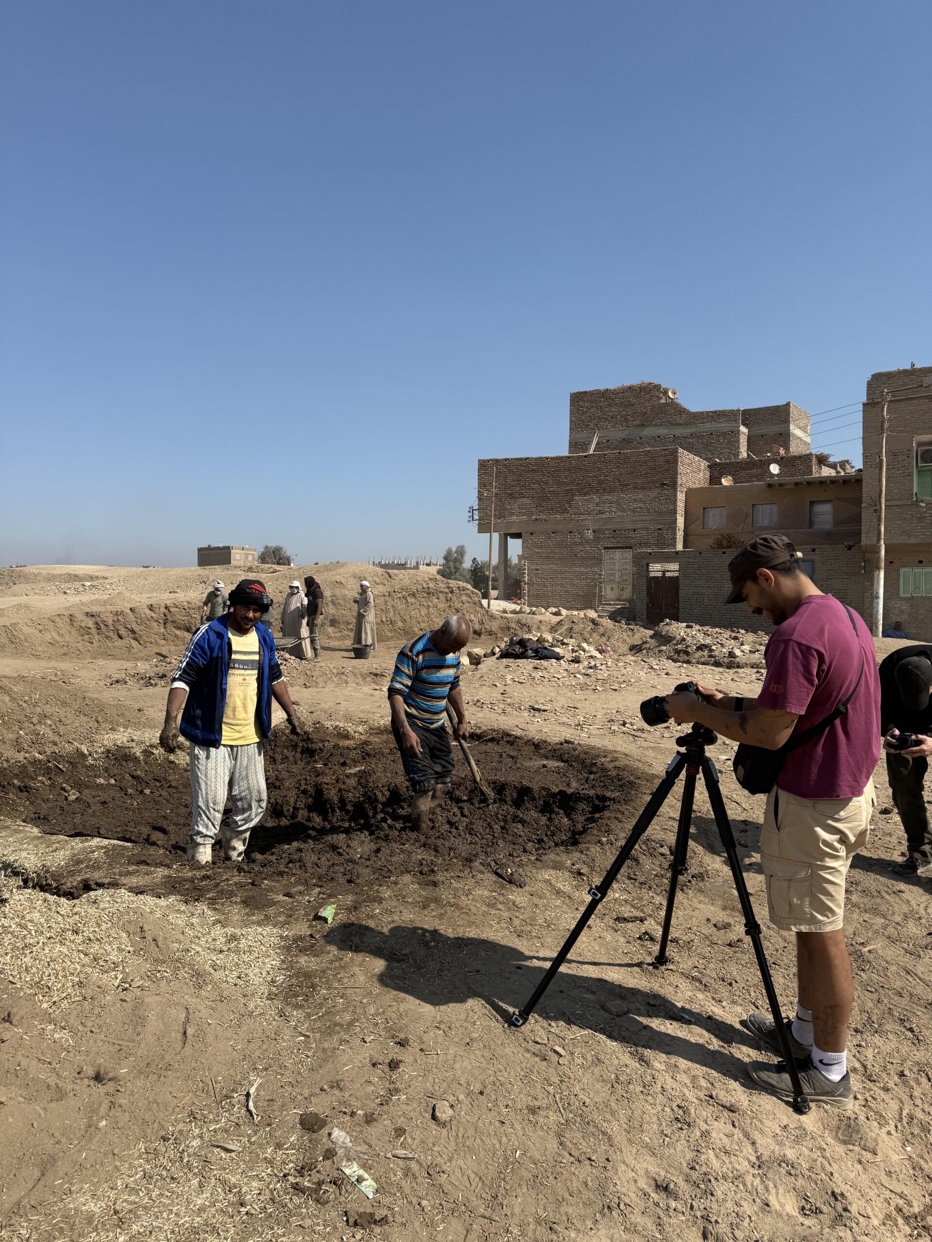 The week concluded with conservation and heritage management efforts at the North Palace Enclosure Wall, where workmen finished stabilizing the foundations and protecting remaining mud brick. Mud brick production also began in preparation for next season’s planned Wall Magazine. Across the site, trenches were backfilled, survey points were recorded for photogrammetry models, and materials were packed for transfer to storage at the end of the season. A brief walking survey west of the site in the high desert by Nicholas Brown identified several areas under threat from modern encroachment and looting. These archaeological sites and pottery scatters–dating to the Second Intermediate Period to New Kingdom transition–underscoring the urgency of documenting threatened areas beyond the core monuments. By the end of Week 3, work across the site—from survey and excavation to conservation, collections, and public outreach through photography and film—was already revealing new insights into the long and complex history of Deir el-Ballas.